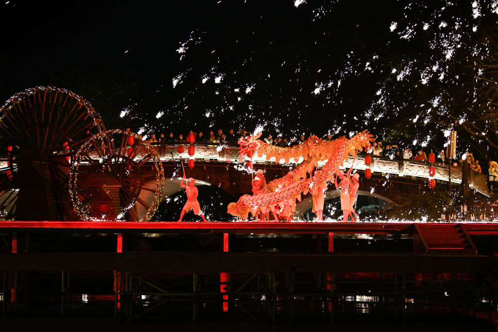 别样的传统非遗项目演出同样在春节期间大放异彩。在成都双流区黄龙溪镇,从初一至初八,这里每晚都会上演“烧火龙”表演。约1500摄氏度的铁汁被击打成10多米高的铁花,舞龙者赤膊上阵,一条金黄的“火龙”穿梭其中,当万千铁花尽情绽放的一刹那,来自五湖四海的人们抬头仰望流光溢彩的夜空,在璀璨的光芒中许下美好愿望,充满烟火气的别样年味儿随之蔓延。
