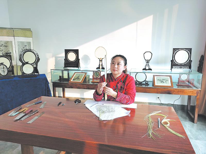 看着展厅里琳琅满目的龚扇艺术品,龚倩如数家珍地给记者介绍起龚扇的分类、编织工艺、设计难点等。工作室里陈列的尺寸最大的工艺品是长约1.8米、宽约1.5米的龚扇屏风《山水》。龚倩骄傲地说,这件作品花费了她近两年的时间,画中山水凝结着她的心血。
