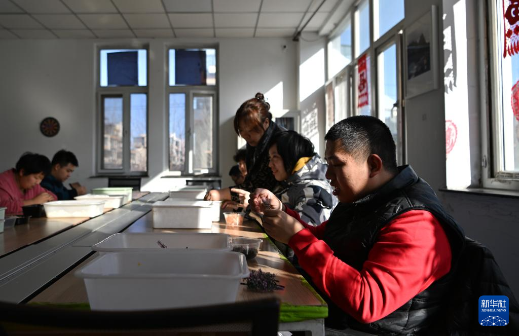 2月22日,在天津市西青区中北镇溪秀苑社区就业站,残疾人在进行手工制作。