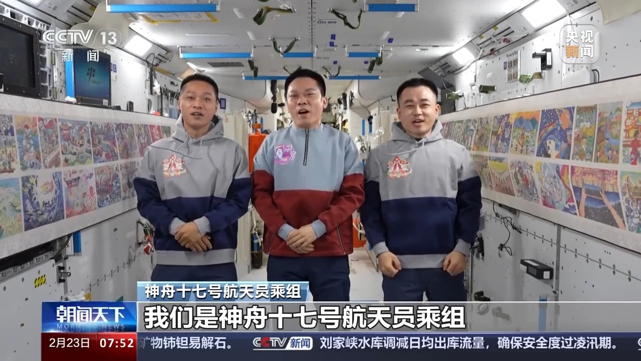 神舟十七号航天员乘组:全国各地的青少年朋友们,大家新年好!我们是神舟十七号航天员乘组,这里是咱们中国人自己的太空家园——中国空间站。分享一个好消息,大家期盼已久的天宫画展又上新了!