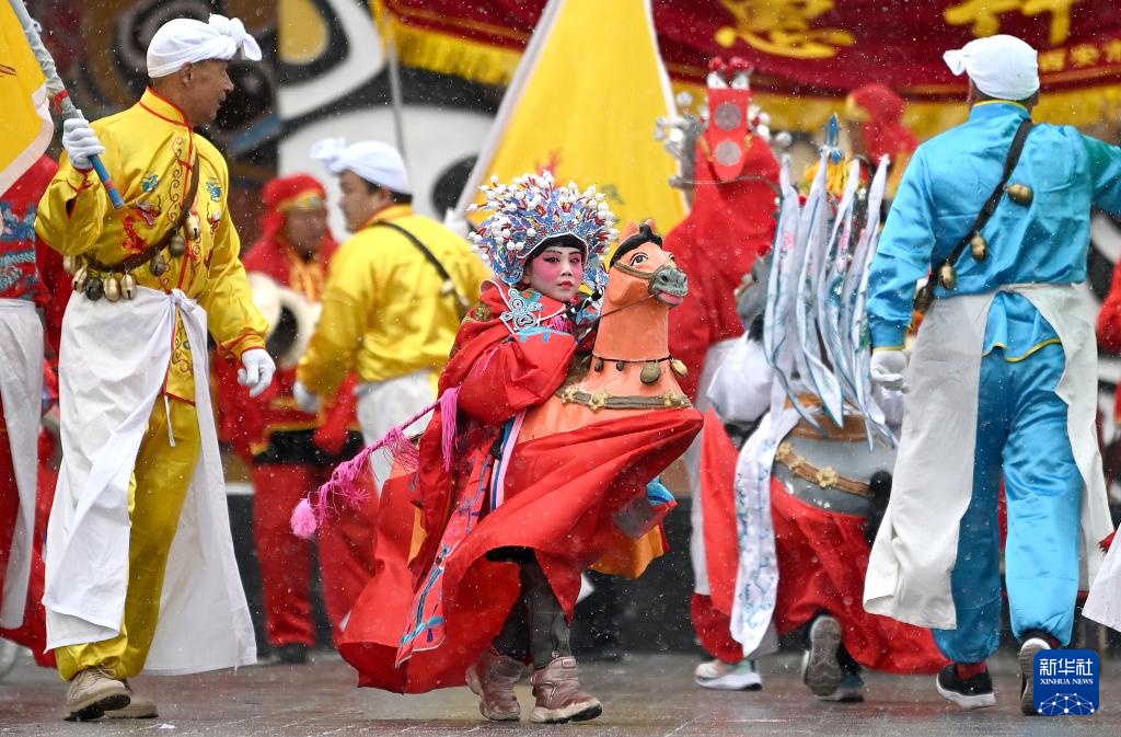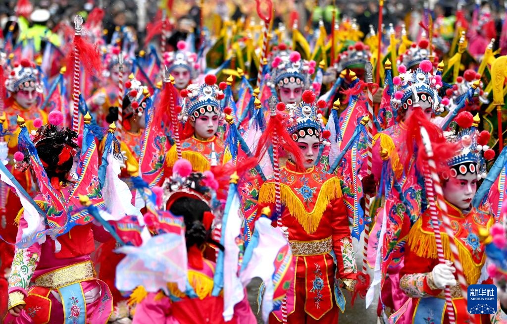 2月22日,在陇州社火过大年暨陕西省民间社火展演上,来自西安市高陵区的社火队在表演药惠竹马。