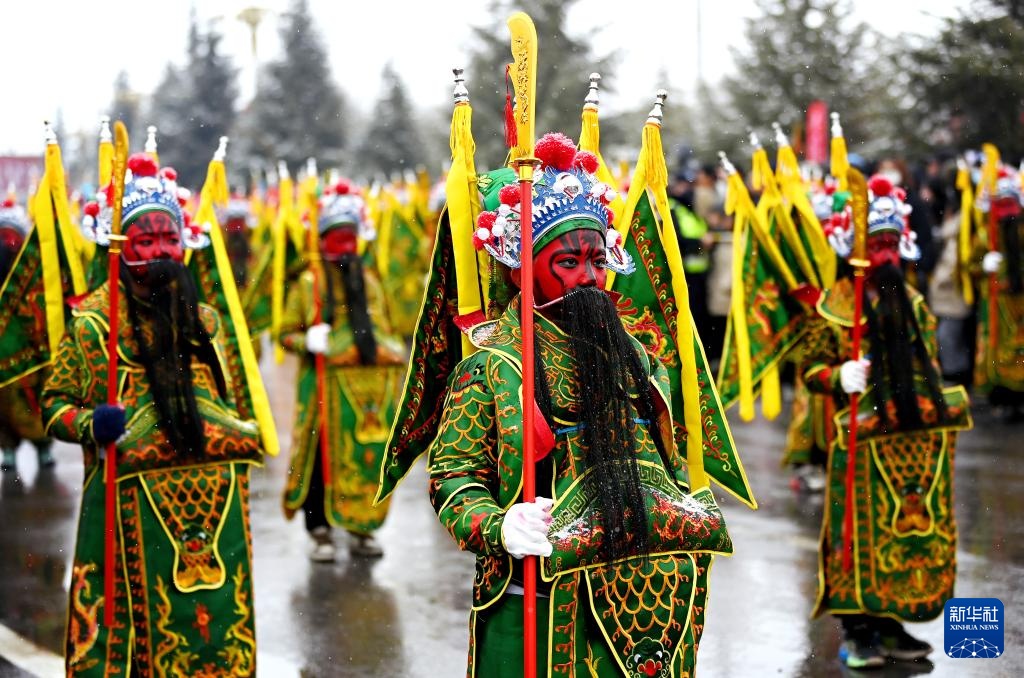 当日是农历正月十三,来自陕西各地市的民间社火代表队齐聚陕西陇县,进行社火展演及巡游活动。在陕西,每年春节期间人们纷纷装扮社火,走乡串户,进行拜年迎春游演。