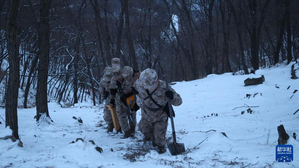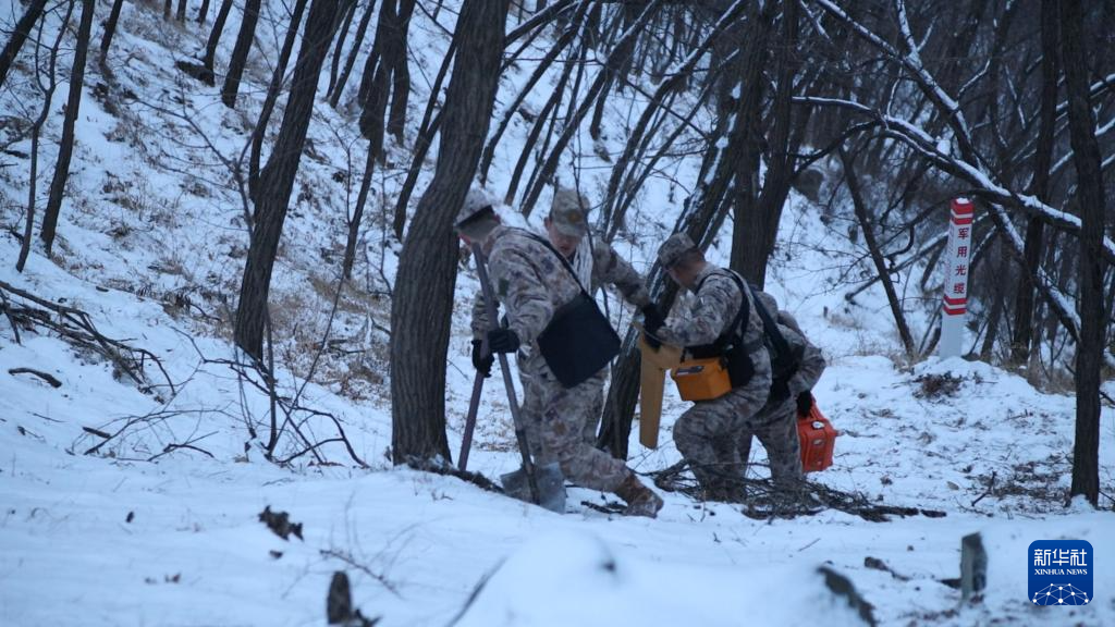 战略支援部队某部泰安站官兵在光缆线路巡检途中(视频截图,2月2日摄)。新华社发(张楚炎 摄)