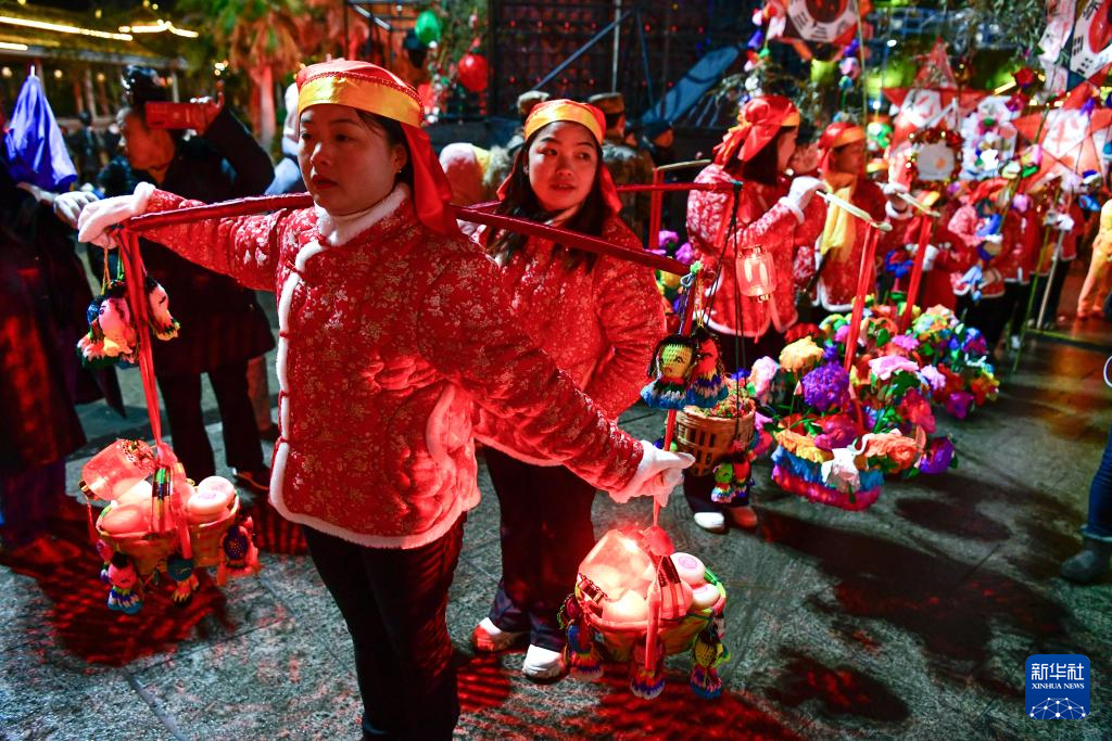 2月23日晚,人们在贵州省台江县参加苗族“舞龙嘘花”活动时挑着花灯等待入场。新华社记者 杨文斌 摄