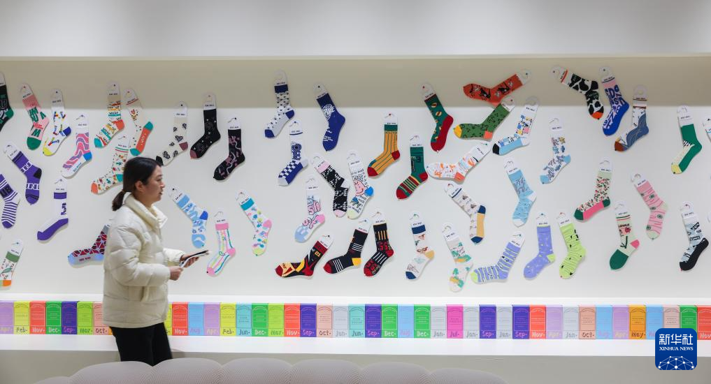 2月24日,一名女子从位于诸暨市的浙江凯诗利科技有限公司袜子样品展示墙前走过。新华社记者 徐昱 摄