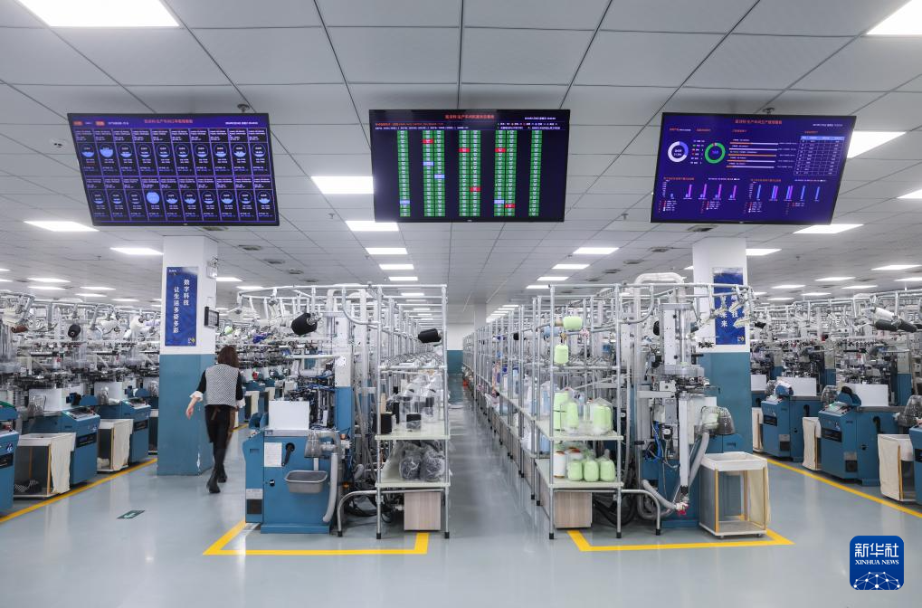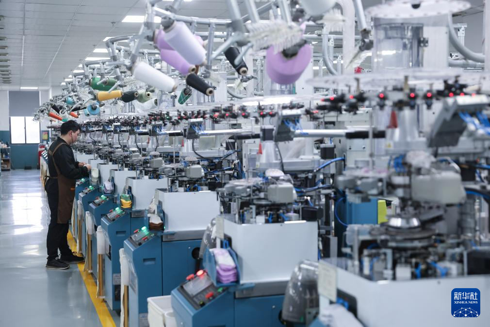 2月24日,在位于诸暨的浙江凯诗利科技有限公司的数字化车间内,织缝翻检智能一体袜机在生产一批春夏款潮袜。新华社记者 徐昱 摄