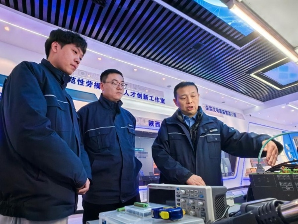董宏涛(中间)正在给青年技工进行技术指导。新华社记者 张斌 摄