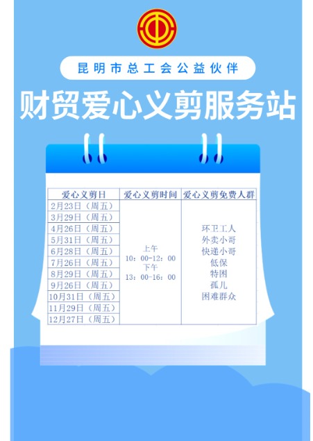 值得一提的是,在昆明市工人文化宫工会驿站,昆明市总工会公益伙伴“财贸爱心义剪服务站”启用啦!环卫工人、外卖小哥、快递小哥等广大户外劳动者群体可以在这里享受爱心义剪日免费理发服务。