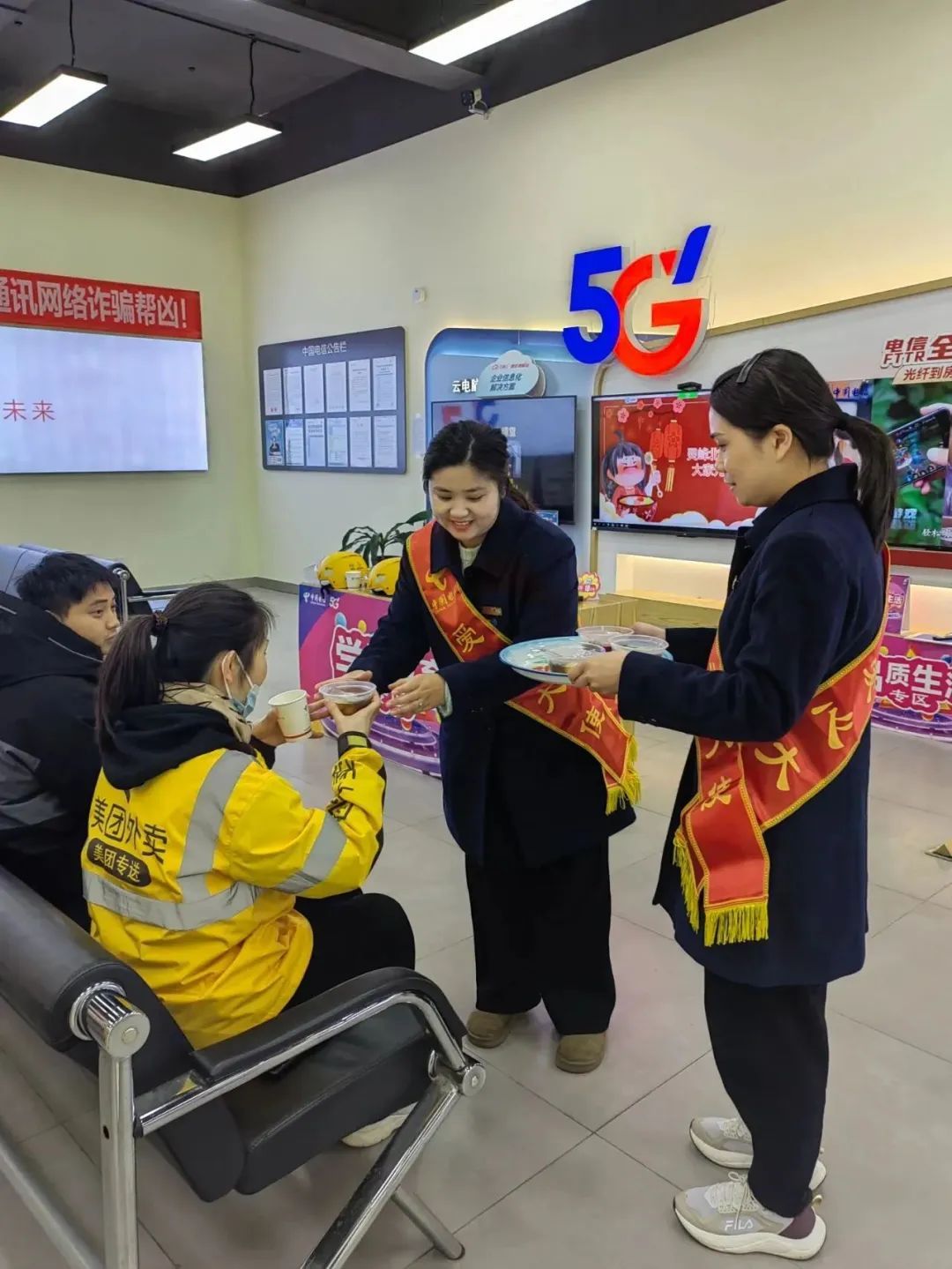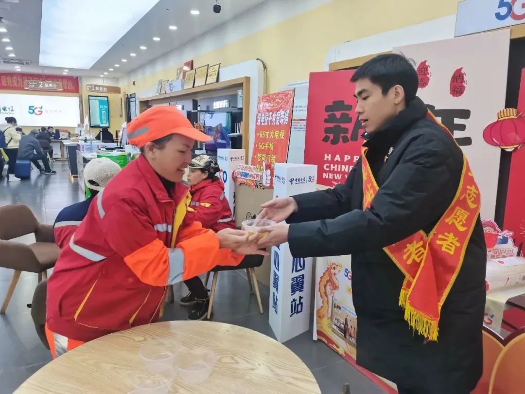这场活动旨在通过实际行动为户外劳动者送上节日的关怀和祝福。环卫阿姨接过爱心大使递过来的一碗汤圆,跟随走进中国电信爱心翼站,在暖气开放的驿站里歇下脚,环卫阿姨边吃汤圆边说:“今天外面天气很冷,吃完汤圆心暖暖的,真好。谢谢你们。”