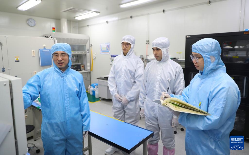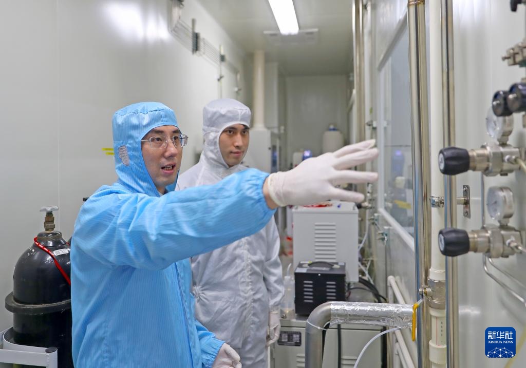 在位于沈阳市的中国科学院金属研究所纳米碳基电子器件超净实验室,孙东明(左)指导研究生在实验过程中学习气路压力调节的操作方法(2月24日摄)。新华社记者 杨青 摄