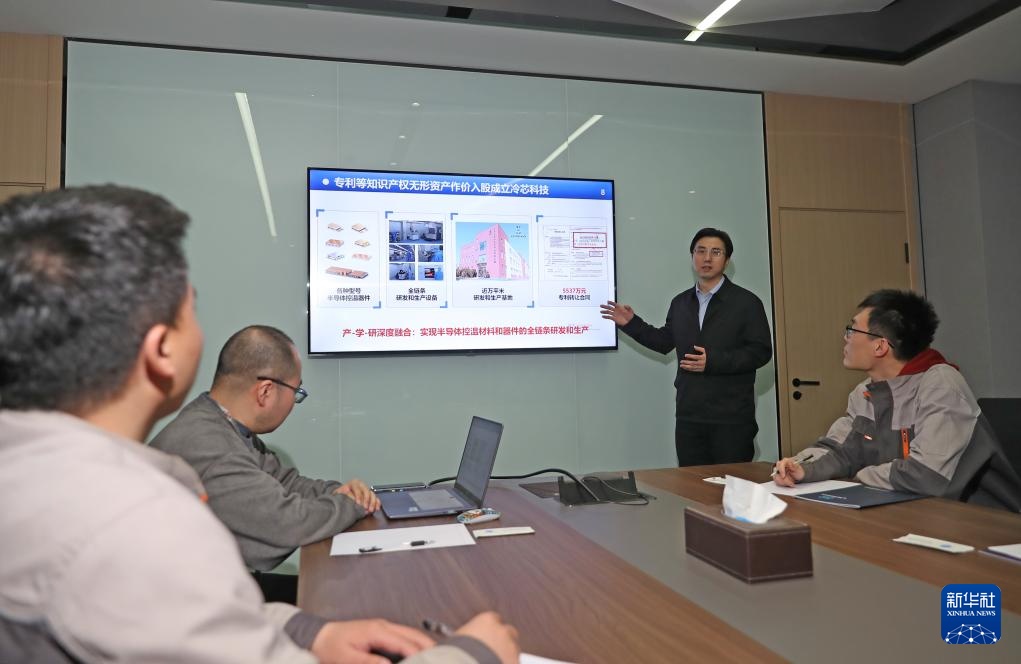 在位于沈阳市的辽宁冷芯半导体科技有限公司,孙东明(右二)与公司工作人员在会议室交流(2月24日摄)。新华社记者 杨青 摄