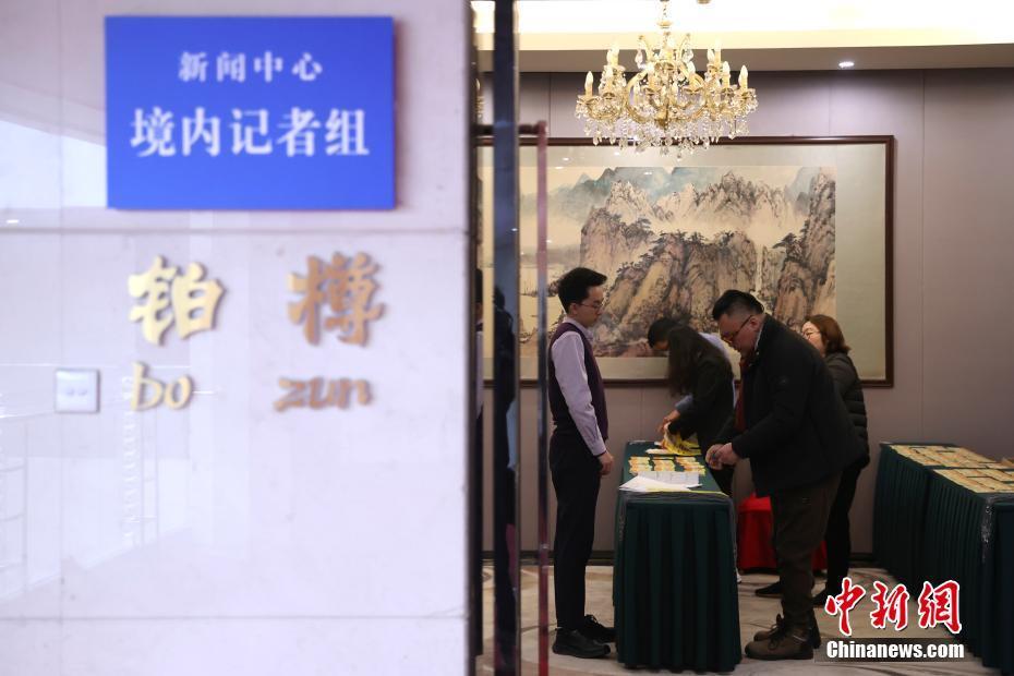 2月27日,在2024年全国两会即将召开之际,位于北京梅地亚中心的全国两会新闻中心正式启用。图为媒体记者在新闻中心领取证件。