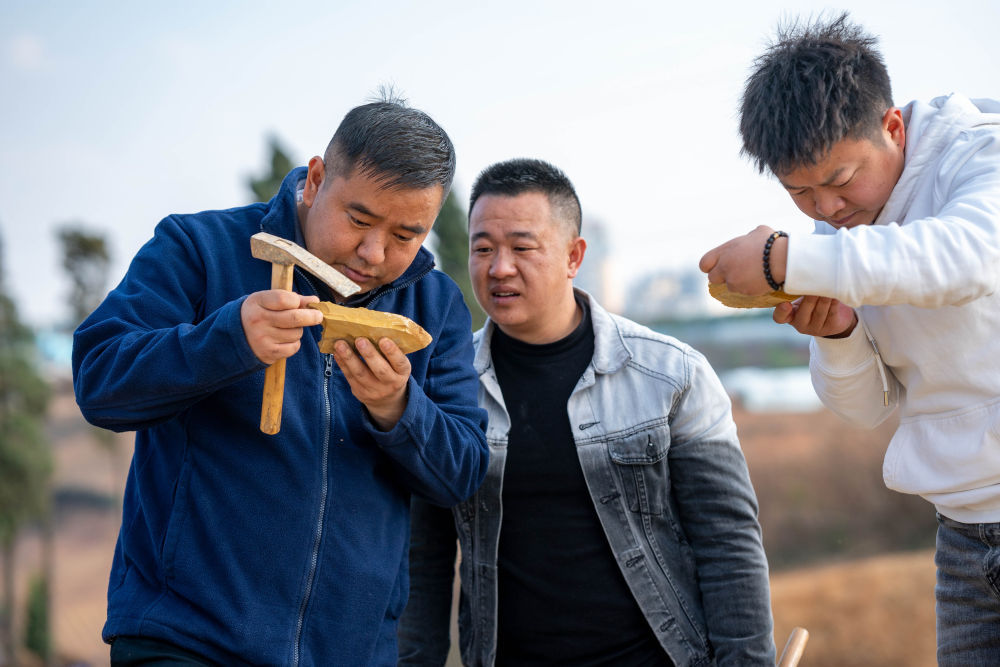 郭进(左一)和同事在云南省澄江市黑蟆地查看采集到的化石标本(2月22日摄)。