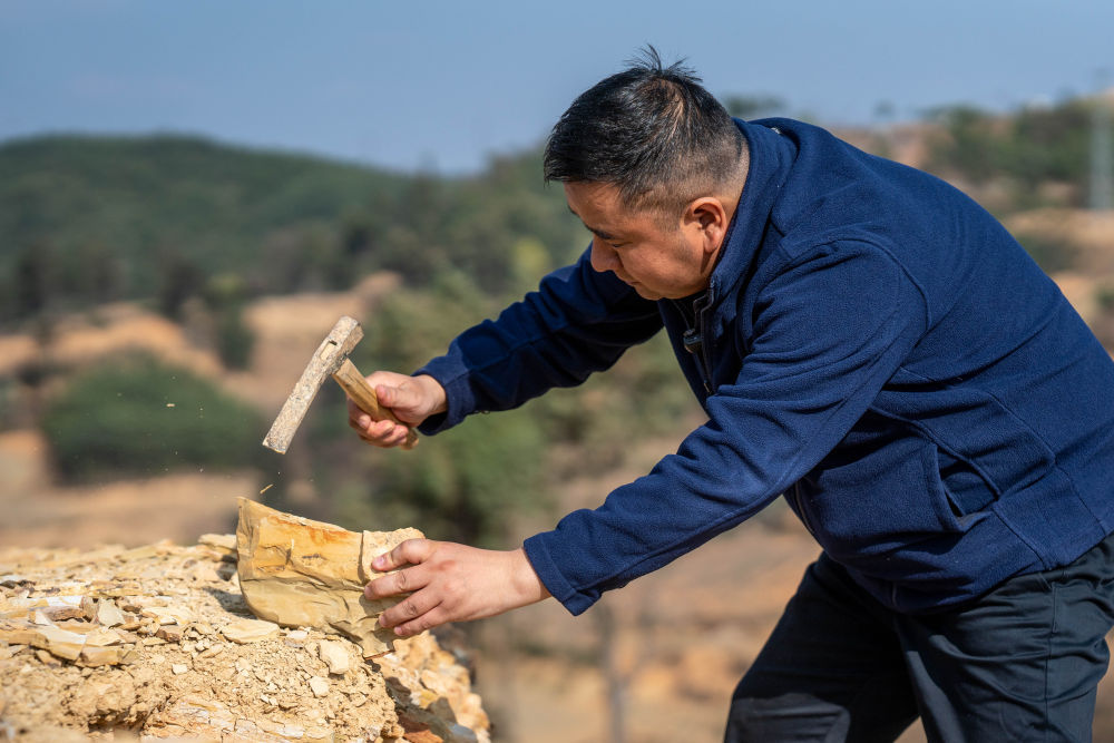 郭进在云南省澄江市黑蟆地采集化石标本(2月22日摄)。