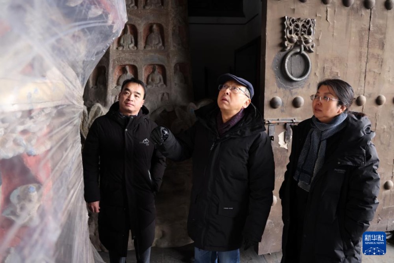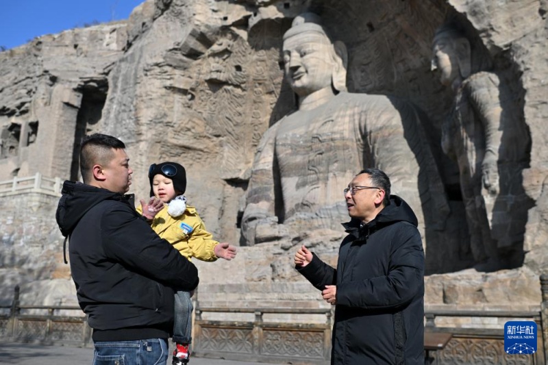 杭侃(右)在云冈石窟调研走访,了解游客的需求(2月25日摄)。