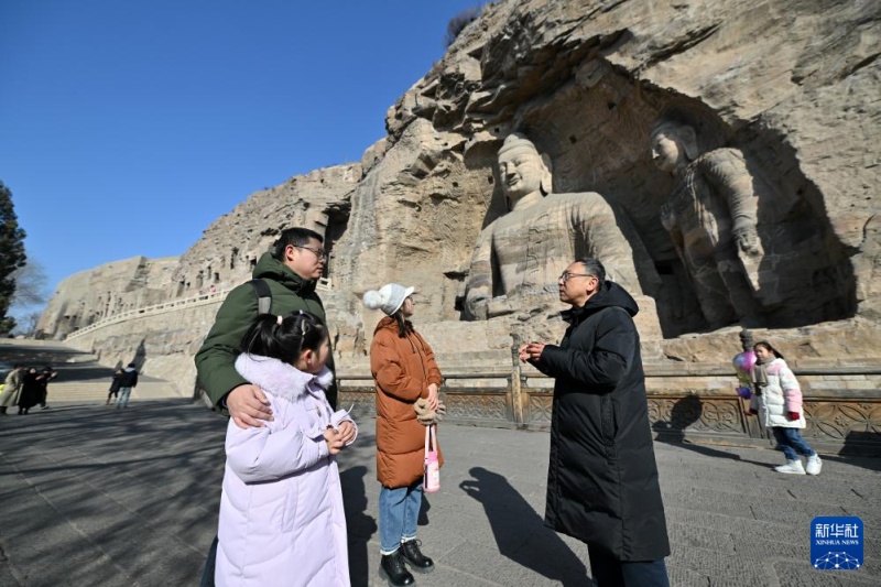 杭侃(右)在给游客讲解云冈石窟的历史知识(2月25日摄)。