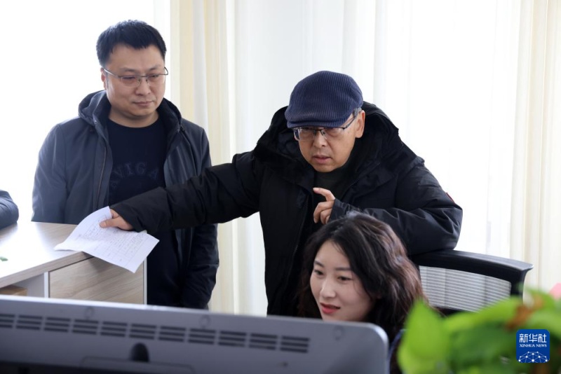 在云冈研究院数字化保护中心,杭侃(左)和同事交流文创产品设计方案(2月25日摄)。