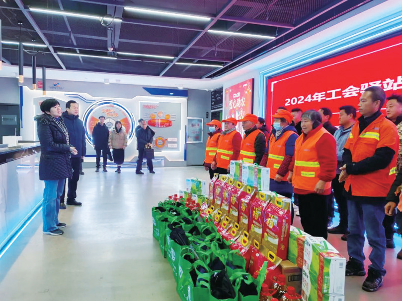 1月31日下午,在佰昌优质农产品物流园工会驿站,市总工会慰问组为20名环卫工人和货车司机送上“暖心”的慰问礼包。