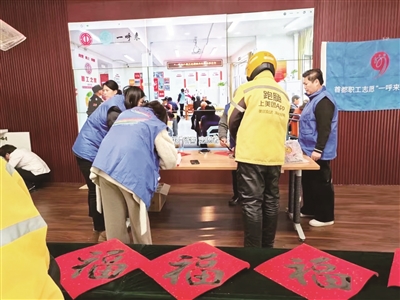 “今天特别高兴,感谢工会‘娘家人’始终惦记着我们,给我们送来了红彤彤的‘福’字,还有这些贴心的服务。”一名快递小哥高兴地说道。此次活动送出“福”字、对联等500余套,累计服务职工200余人,新就业形态劳动者150余人。