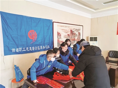 1月27日,首都职工志愿密云区“大篷车”开进密云区十里堡镇明珠花园社区,集结密云区明鑫社区服务中心、密云区和畅法律服务中心、檀州便民社区服务中心、密云区世济医院、贝康口腔等多家社会组织、爱心企业,为辖区职工群众、新就业形态劳动者等带来中医义诊、送“福”字等志愿服务。