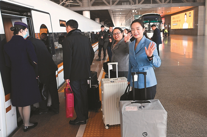 3月3日,出席十四届全国人大二次会议的住苏全国人大代表,从南京出发奔赴首都参加“春之盛会”,与各地代表同谱“春之序曲”,共商国是、共谋发展,向无限美好的春天进发。新华日报记者 肖勇 万程鹏 摄