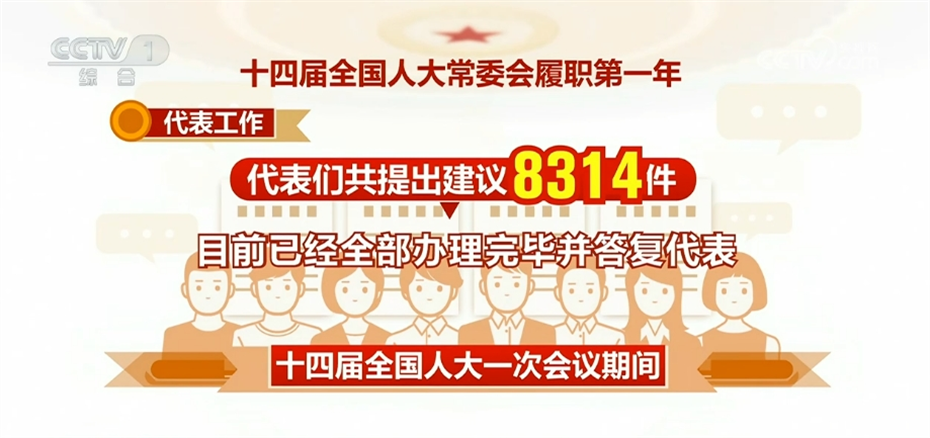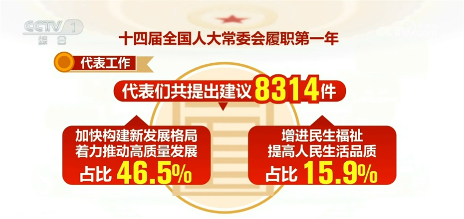 代表工作方面:十四届全国人大一次会议期间,代表们共提出建议8314件,目前已经全部办理完毕并答复代表。其中,涉及加快构建新发展格局、着力推动高质量发展的占比46.5%,涉及增进民生福祉、提高人民生活品质的占比15.9%。