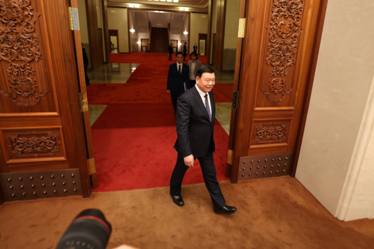 大会发言人娄勤俭步入发布会现场。