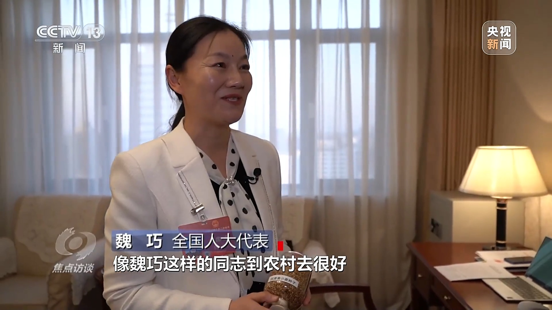 全国人大代表 魏巧:“去年,总书记赞许我们说‘像魏巧这样的同志到农村去很好’,毕竟我们是从科研单位回到家乡的,农业的高质量发展离不开科技兴农,所以我带来了我们的新品种,也是我们的一个小成绩。”