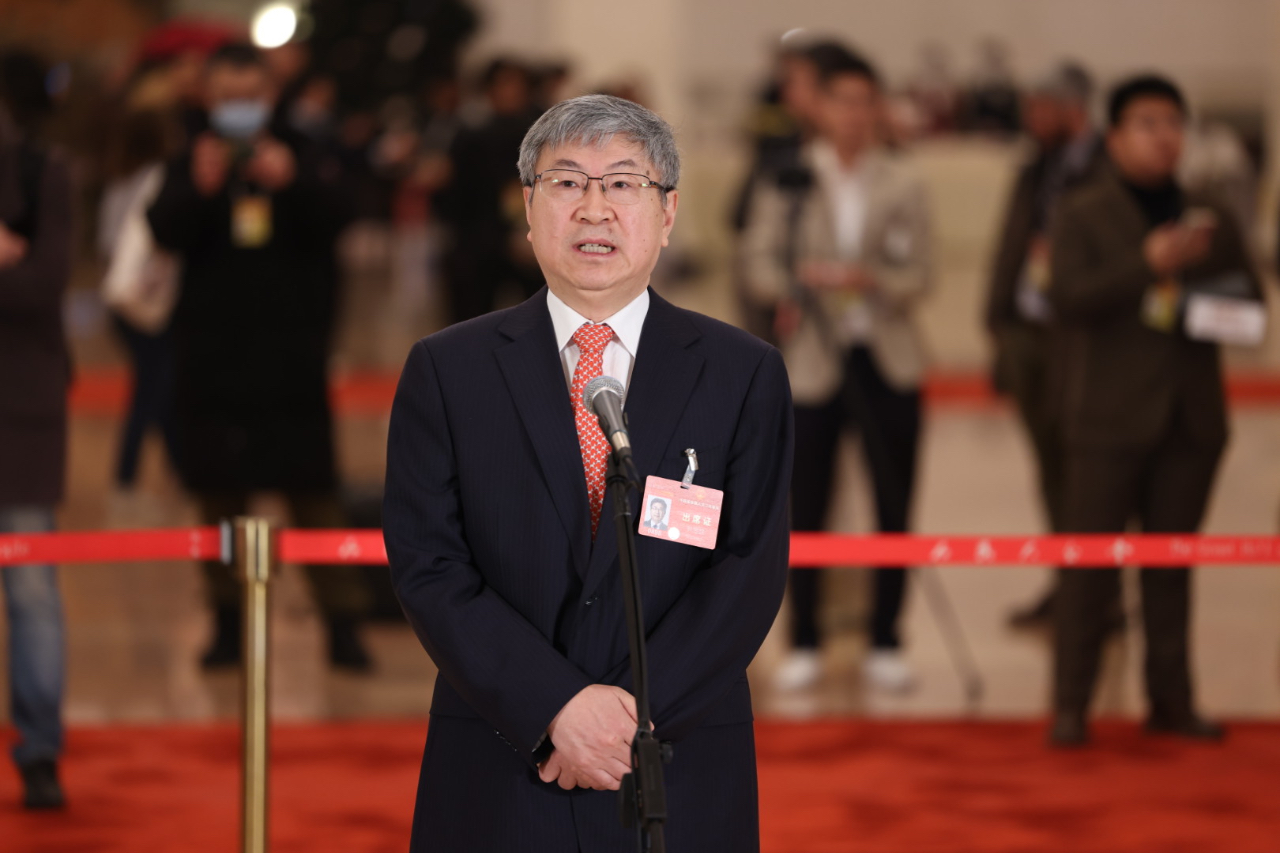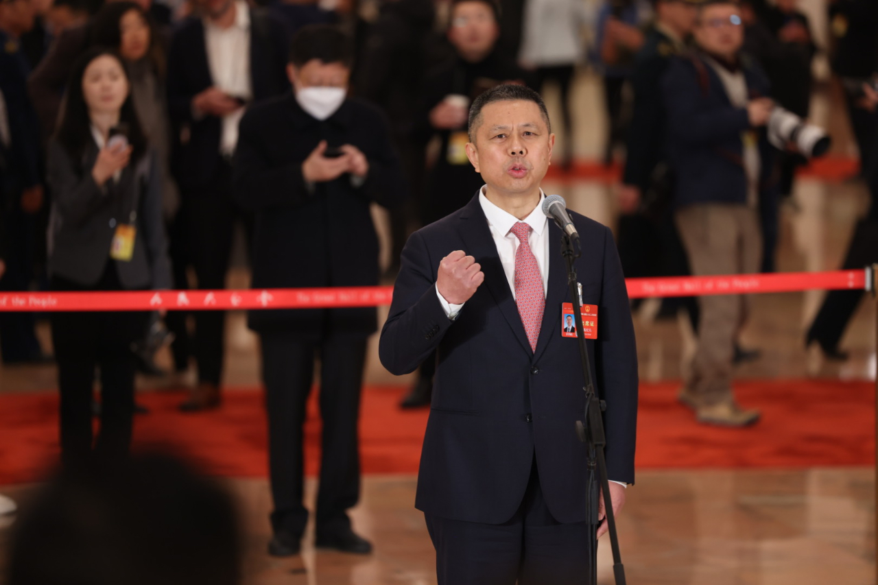 3月5日,十四届全国人大二次会议首场“代表通道”集中采访活动在北京人民大会堂举行。这是全国人大代表高纪凡接受媒体采访。