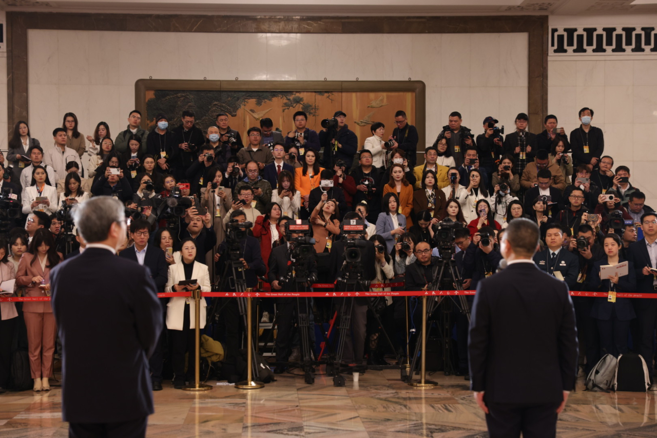 3月5日,十四届全国人大二次会议首场“代表通道”集中采访活动在北京人民大会堂举行。这是记者在提问。