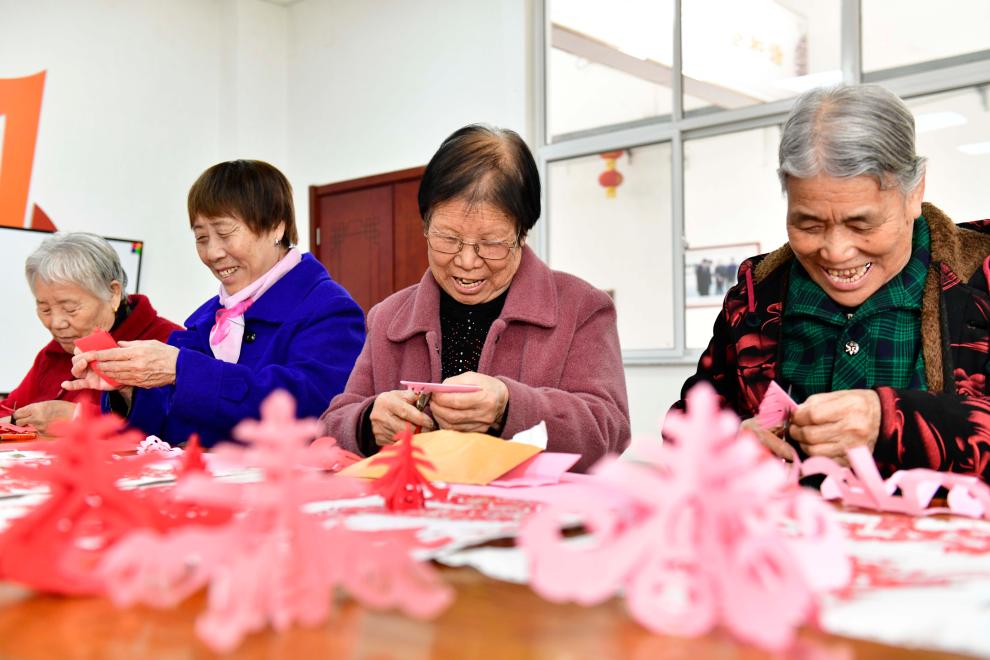3月2日,在山东省滨州市博兴县博华老年公寓文体活动室,老人们在剪纸。新华社记者 郭绪雷 摄