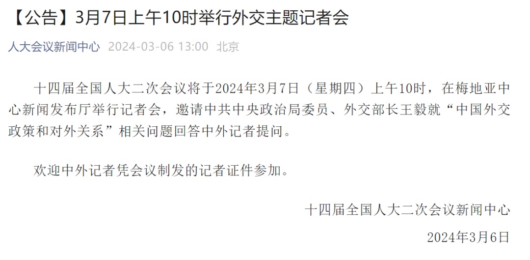 十四届全国人大二次会议将于2024年3月7日(星期四)上午10时,在梅地亚中心新闻发布厅举行记者会,邀请中共中央政治局委员、外交部长王毅就“中国外交政策和对外关系”相关问题回答中外记者提问。