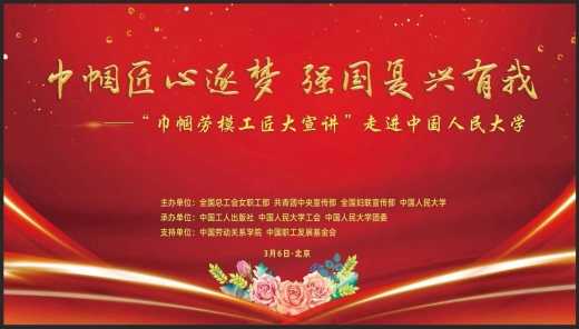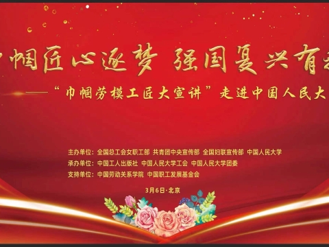 直播回顾丨她们来了!巾帼劳模工匠大宣讲走进人民大学 为深入学习领会习近平新时代中国特色社会主义思想和党的二十大精神,贯彻落实中国工会十八大精神,大力弘扬劳模精神、劳动精神、工匠精神,在第114个“三八”国际劳动妇女节前夕,中华全国总工会女职工委员会于2024年3月6日举办巾帼匠心逐梦 强国复兴有我——“巾帼劳模工匠大宣讲”走进中国人民大学活动。中工网首页、微博、抖音、快手、视频号同步直播。