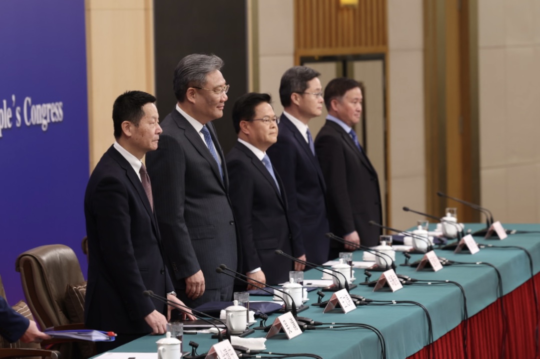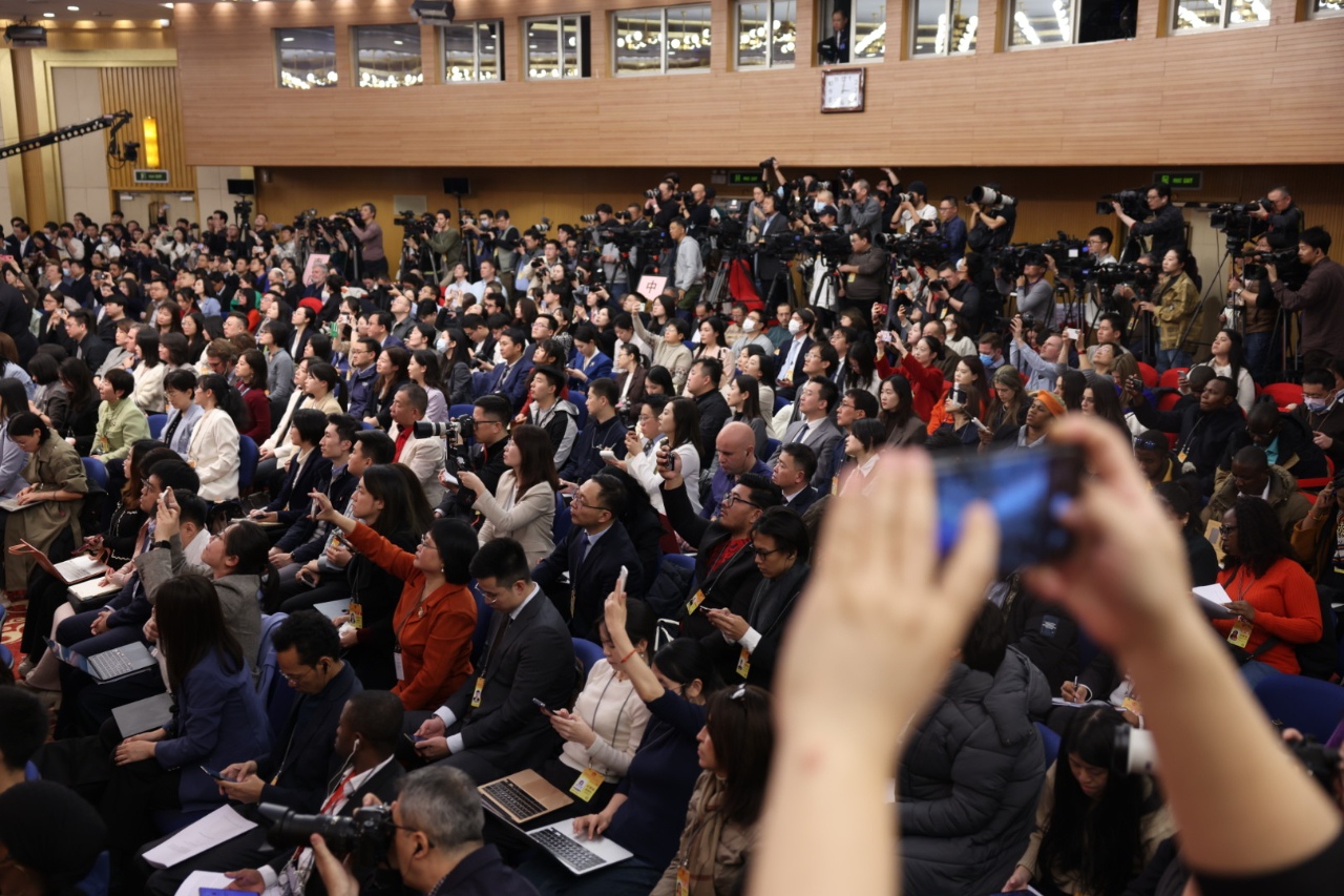 3月6日下午3时,十四届全国人大二次会议在梅地亚中心新闻发布厅举行记者会,邀请国家发展和改革委员会主任郑栅洁、财政部部长蓝佛安、商务部部长王文涛、中国人民银行行长潘功胜、中国证券监督管理委员会主席吴清就发展改革、财政预算、商务、金融证券等相关问题回答中外记者提问。(工人日报—中工网记者 王伟伟摄)