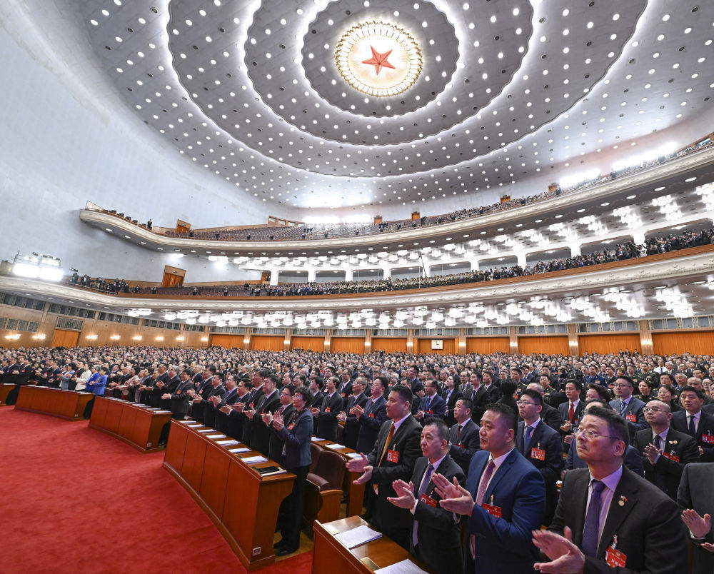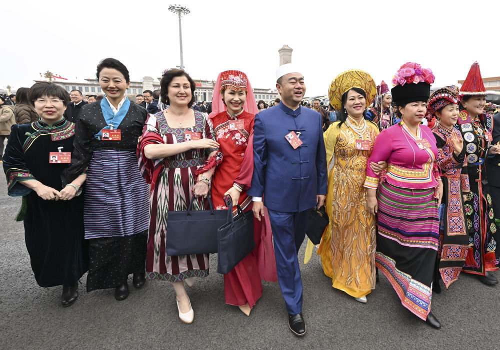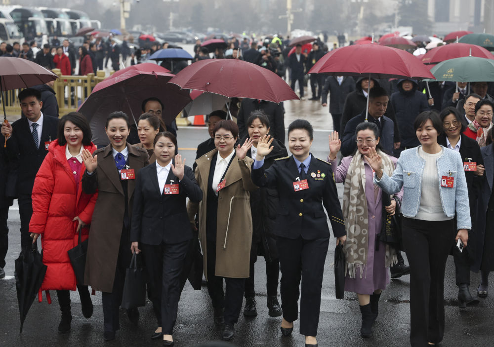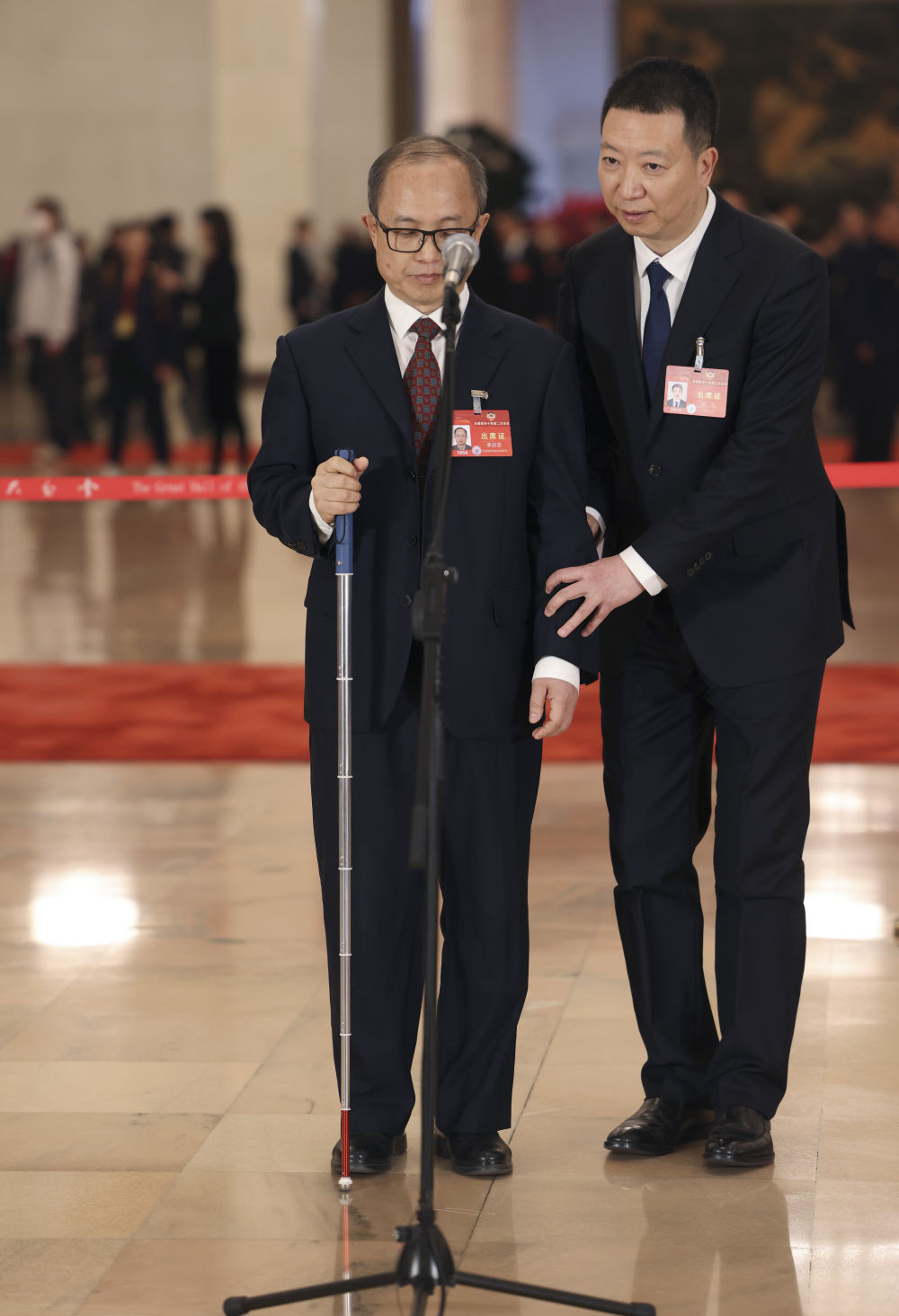 3月5日,全国人大代表王永澄用手指阅读盲文版大会文件。