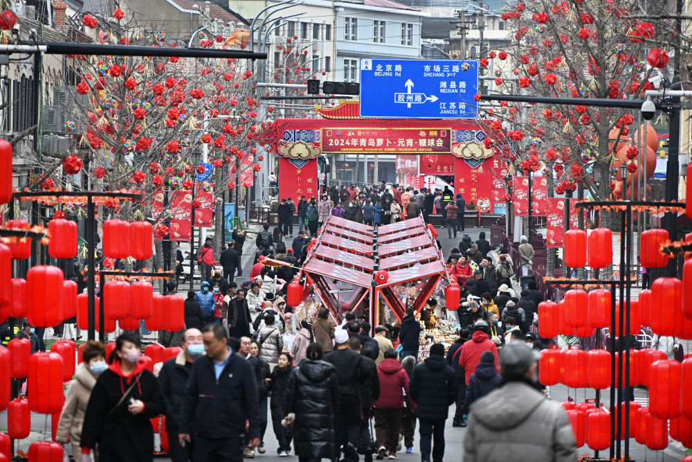 2024年2月18日,游客在2024年青岛萝卜·元宵·糖球会上消费、游玩。新华社记者李紫恒摄