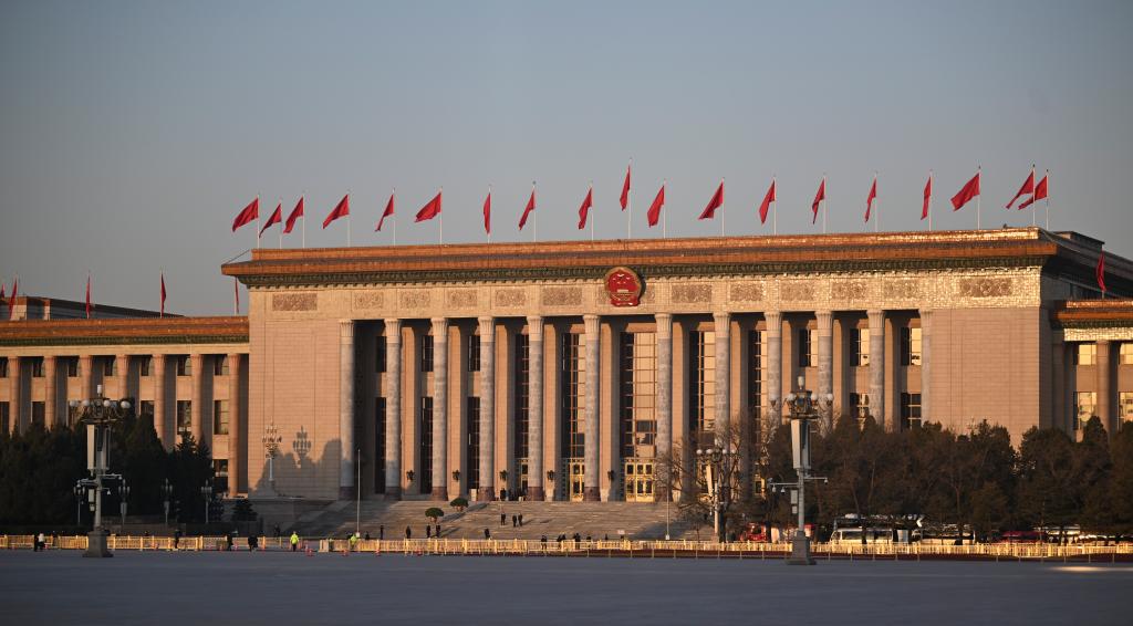 3月9日,全国政协十四届二次会议在北京人民大会堂举行第三次全体会议。这是晨光下的人民大会堂。新华社记者 陈晔华 摄