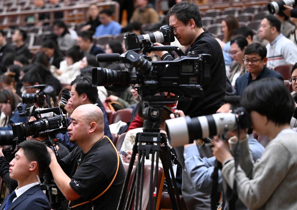 3月9日,全国政协十四届二次会议在北京人民大会堂举行第三次全体会议。这是记者在采访。新华社记者 陈晔华 摄