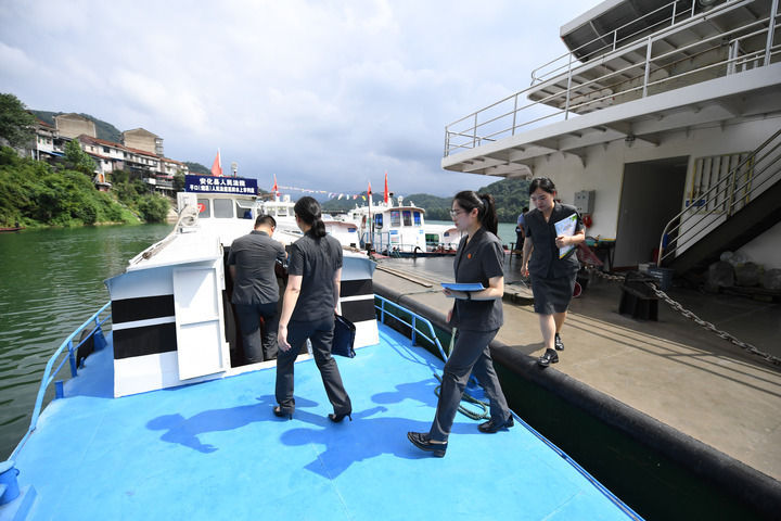 2023年7月19日,湖南省益阳市安化县人民法院干警在柘溪客运码头登上“水上法庭”。“水上法庭”可以开到离当事人更近的港口、岸边,为群众减轻诉累。新华社记者 薛宇舸 摄