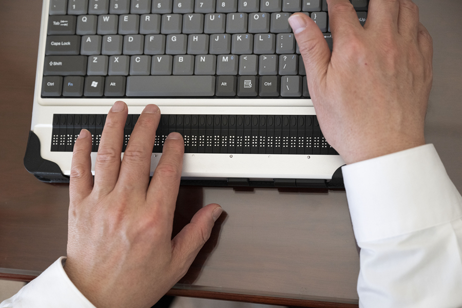 3月3日,王永澄代表在北京的驻地房间里展示他的盲文笔记本电脑。该电脑没有显示屏,上部是普通键盘,下部是可刷新的盲文显示器,视障人士可以通过用手触摸来获得信息。