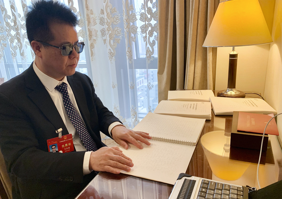 3月5日,在北京的驻地房间内,王永澄代表用手指触摸阅读盲文版政府工作报告。