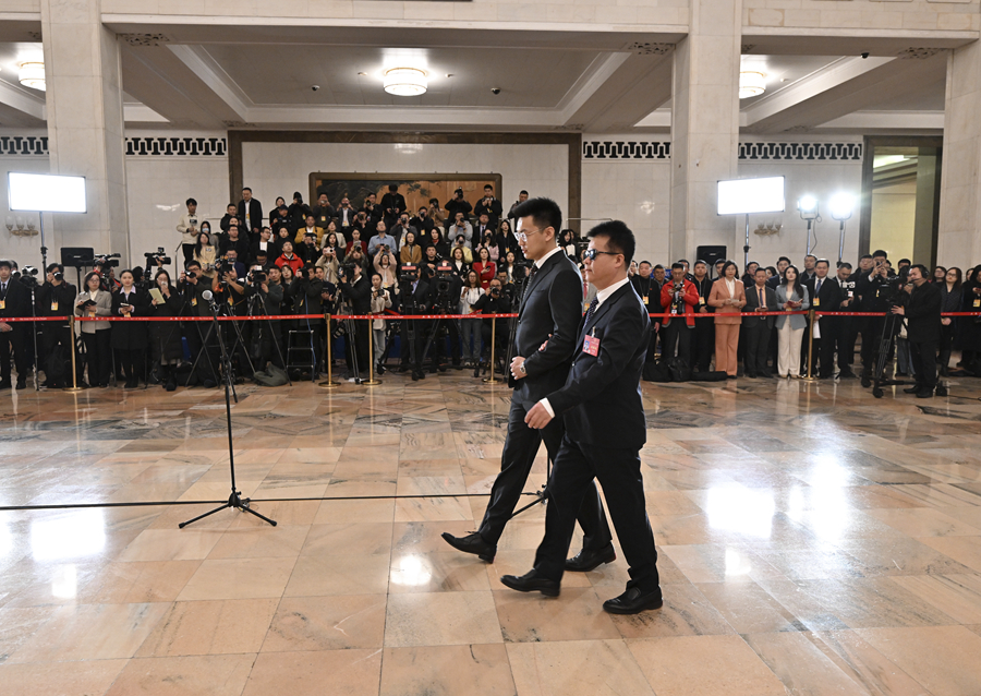3月8日,在十四届全国人大二次会议第二场“代表通道”上,王永澄代表(前右)在工作人员的协助下前行,准备回答记者提问。