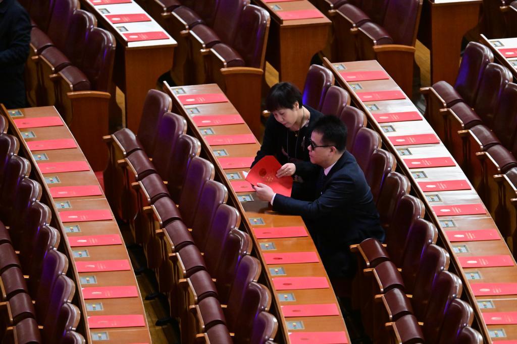 3月11日,第十四届全国人民代表大会第二次会议在北京人民大会堂举行闭幕会。这是闭幕会开始前,盲人代表王永澄(右)早早来到会场熟悉大会材料。