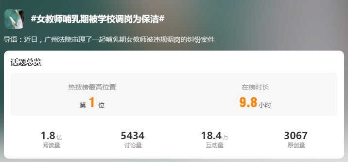 女性在孕期、产期和哺乳期是受到法律特殊保护的,然而现实中,仍有个别用人单位损害“三期”女职工合法权益。3月12日,话题#女教师哺乳期被学校调岗为保洁#冲上热搜,引发网友热议。