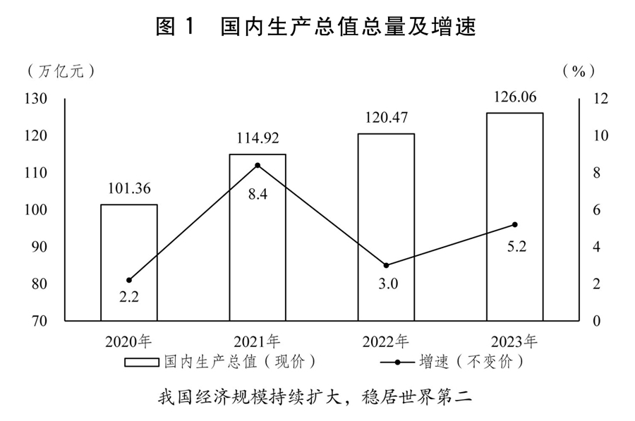 2023年经济社会发展主要预期目标圆满完成,经济发展、社会民生等预期目标完成情况较好;创新驱动发展成效明显,研发经费投入强度、数字经济核心产业增加值占比持续提高;绿色低碳转型深入推进,非化石能源占比稳中有升,主要污染物排放量继续下降;民生福祉不断增进,城镇新增就业超额完成任务,居民收入增长快于经济增长,基本公共服务进一步加强;粮食安全保障有力,原油、天然气产量持续增长。受出口增速回落、房地产销售和投资收缩、部分行业产能过剩等影响,一些行业生产恢复不及预期,工业增长与预期目标有一定差距。工业和民用领域能源消费增长较快,导致能耗强度下降和碳强度下降不及预期。