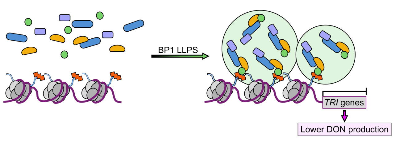 该研究发现,禾谷镰孢菌组蛋白甲基化修饰阅读器蛋白BP1负调控致呕毒素合成基因的转录。采用细胞生物学动态定位观察等技术发现,阅读器蛋白BP1发生液—液蛋白相分离,进而介导组蛋白甲基化修饰的识别,并阐明了其调控致呕毒素合成等毒性基因的转录抑制分子机制。
