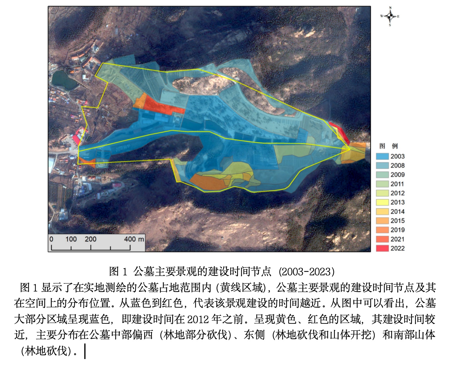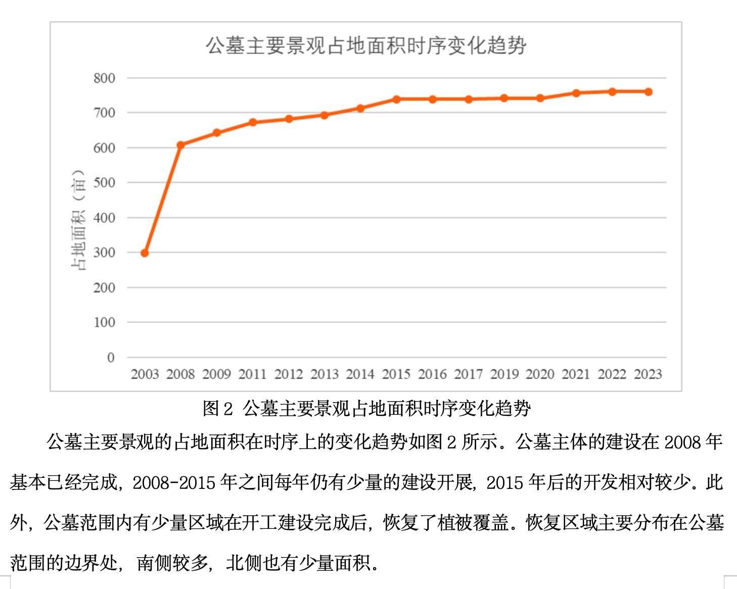 2003年以来的历年影像图片显示:近十余年来,整个太平陵公墓区域侵占林地和破坏植被较为严重的有两处,一是公墓南部山头的砍伐,破坏面积47亩左右,后续大约有21亩的恢复了植被;二是公墓东部区域的山体破坏和砍伐,最近在2022年仍有植被破坏现象,破坏面积22亩左右。继续来听记者的报道: