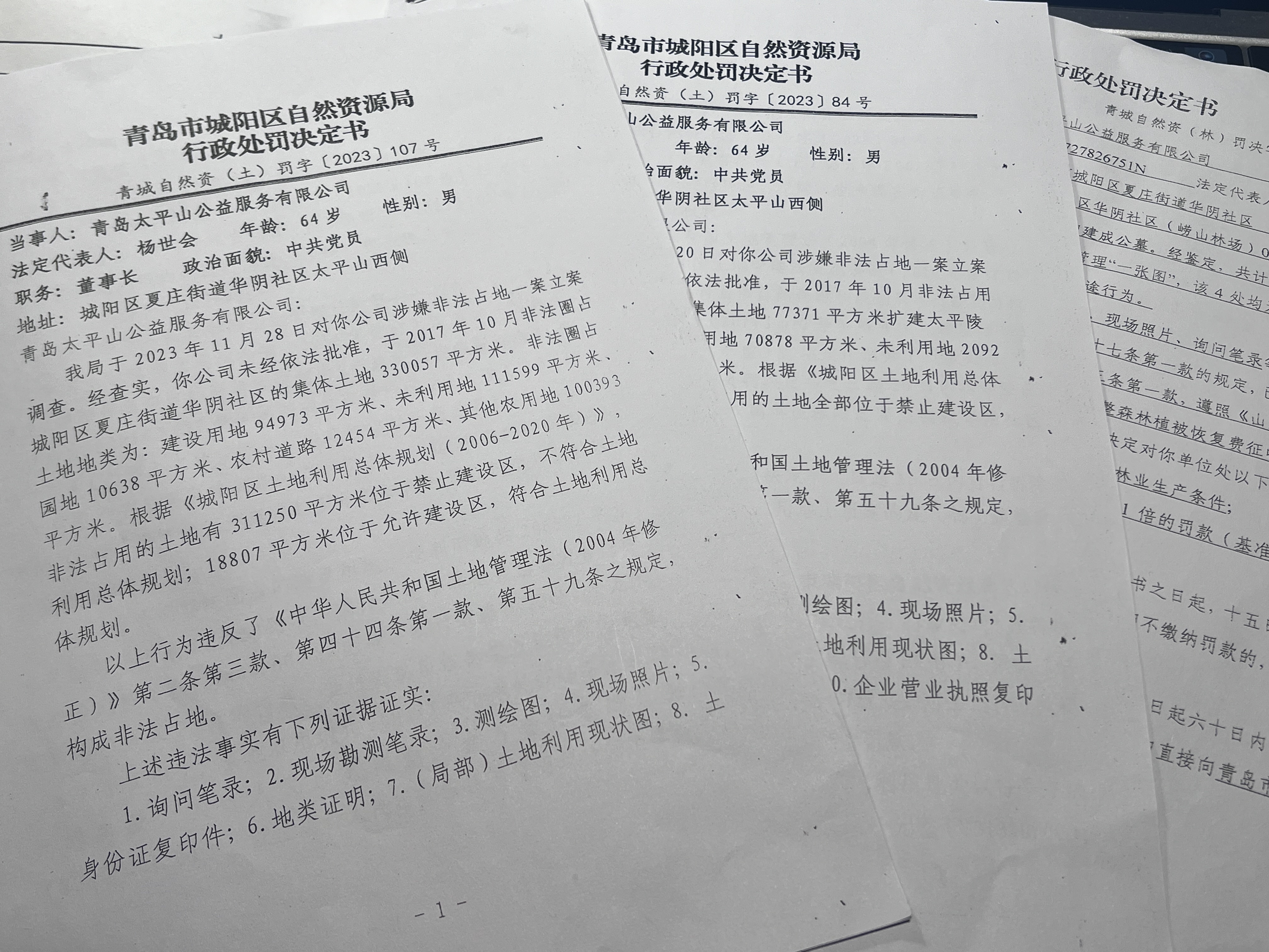 据青岛市行政处罚与行政强制信息公示平台显示,2023年11月、12月,城阳区自然资源局向太平陵公墓运营方青岛太平山公益服务有限公司,开出3份罚单共计罚款900多万元。其中一份罚单明确其涉嫌违法使用林地建设墓地,两份罚单涉及非法圈占华阴社区集体土地建太平陵公墓。实际上,在2017年,太平山公司因非法占用土地已被罚85万多元。