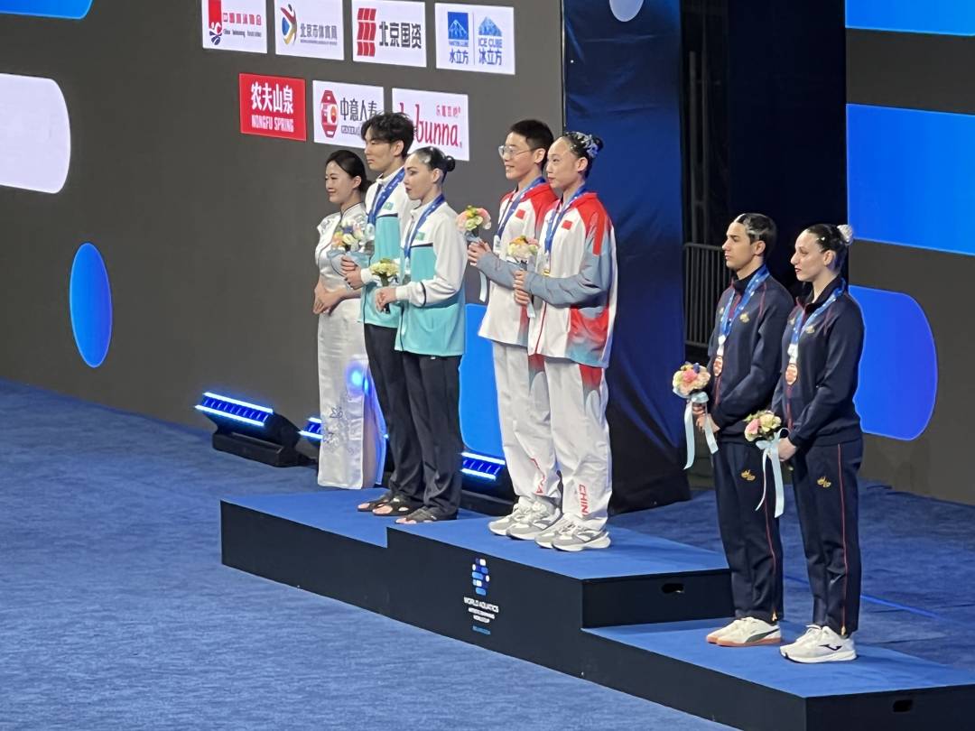4月5日,2024年世界泳联花样游泳世界杯北京站比赛在国家游泳中心“水立方”开赛。在混合双人技术自选决赛中,中国队季荷悦/郭牧也组合夺得冠军。