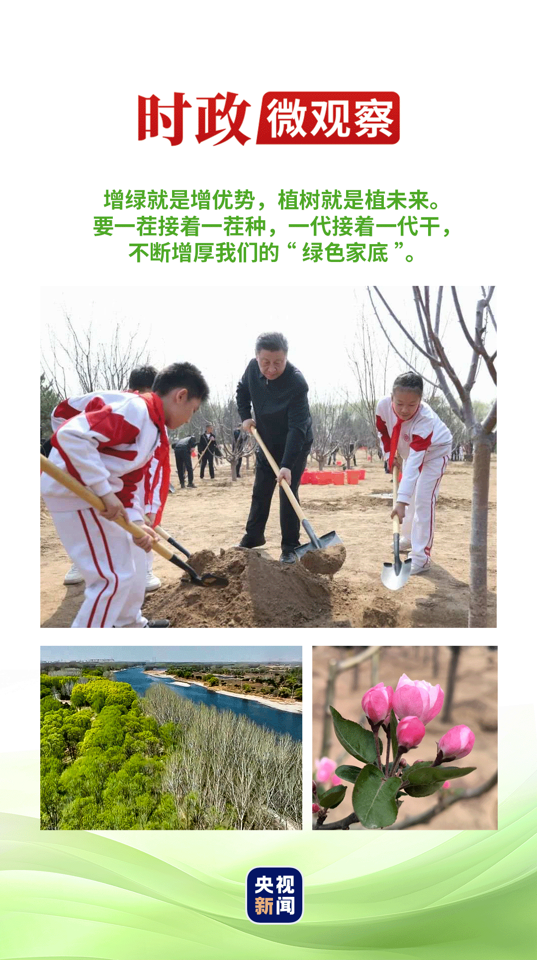“增绿就是增优势,植树就是植未来。”今年植树时,习近平总书记提出,绿化祖国要扩绿、兴绿、护绿并举。